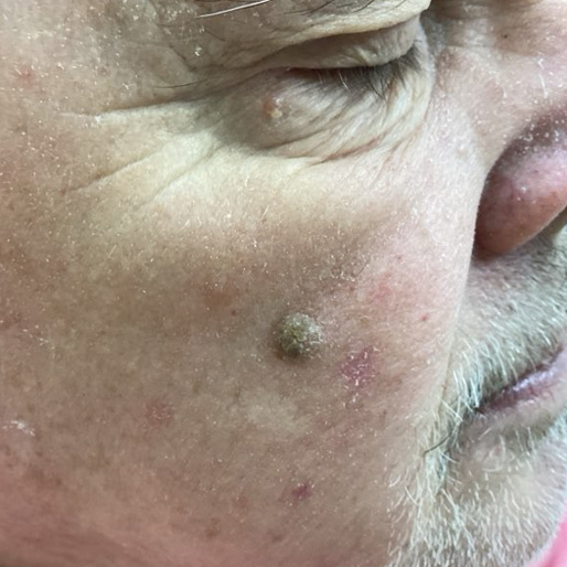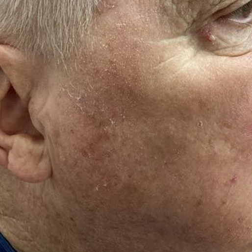 A 76-year-old man from Fuquay-Varina presented with a bothersome keratosis ‘age spot’ on his right cheek. The seborrheic keratosis was successfully removed by board-certified dermatologist and skin surgeon Dr. Thomas Knackstedt with cryosurgery.